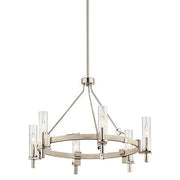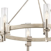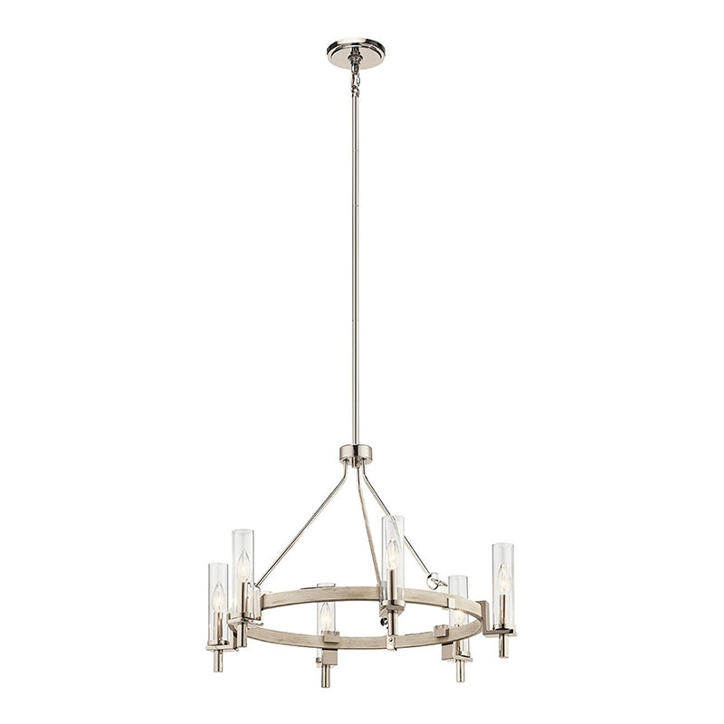 Glamour meets farmhouse charm with this 6 light chandelier from the Telan collection. A mixture of metal finishes and whitewashed wood-tones bring a homespun touch, while the clean lines and fluted glass shades provide the polishing end effect.