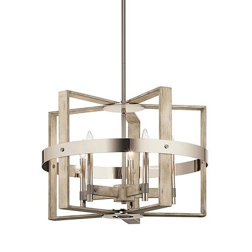 The popular industrial-inspired cage look gets a refreshing update with the Peyton collection 5 light chandelier. Squared edges and lines, in a blend of whitewashed wood tones as well as polished and satin nickel metals, create a style that’s soft and modern.