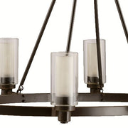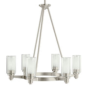 Smooth and tailored, this unusual 6 light Circolo(TM) chandelier combines contemporary design with European flair. Clear cylindrical glass globes with Etched Glass centers repeat the circular theme extending the artistry.