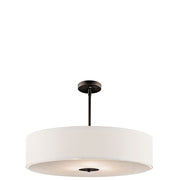 The clean lines and simple styling make this versatile 3 light semi flush ceiling fixture or pendant distinctive. Featuring a classic, Brushed Nickel finish and Olde Bronze Finish, a White Microfiber shade and a Satin Etched Tempered Glass diffuser, this design can complement any space.