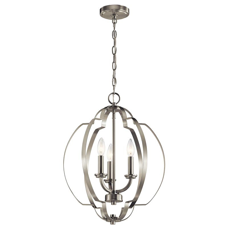 Designed with an intertwined spherical shape and geometrical details, the Voleta 3-light pendant with Brushed Nickel finish makes a great statement piece, adding visual interest to any room.