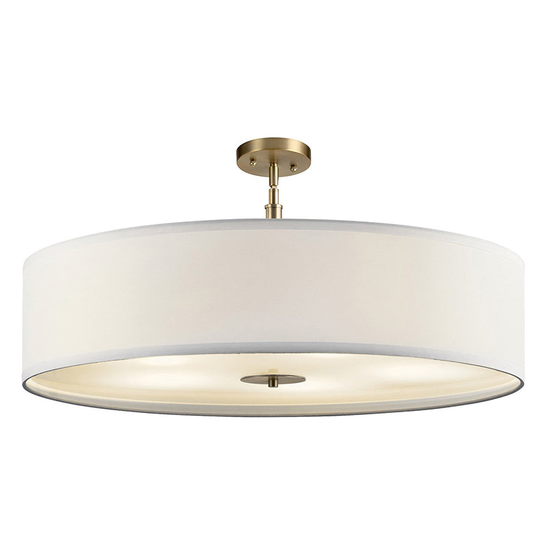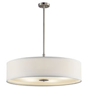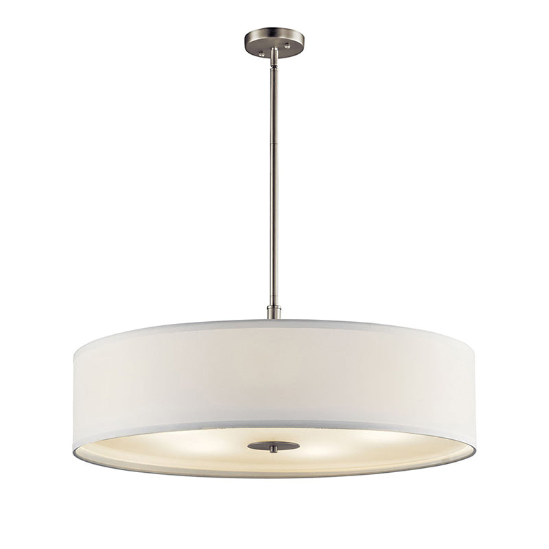 This 5 light transitional pendant features a pleasing drum shape in a finishes and White micro fiber shade.
