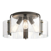 The 3-light semi-flush mount fixture from the Thoreau collection unites finishes and seeded glass together with exposed bolts for a minimalistic design that easily coordinates with many home décor styles.