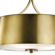 This 3 light convertible pendant/semi flush ceiling light from the updated traditional Maclain collection features smooth lines in a Natural Brass finish with subtle and pleasing Satin Etched White glass.