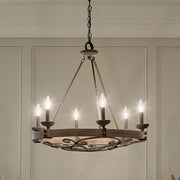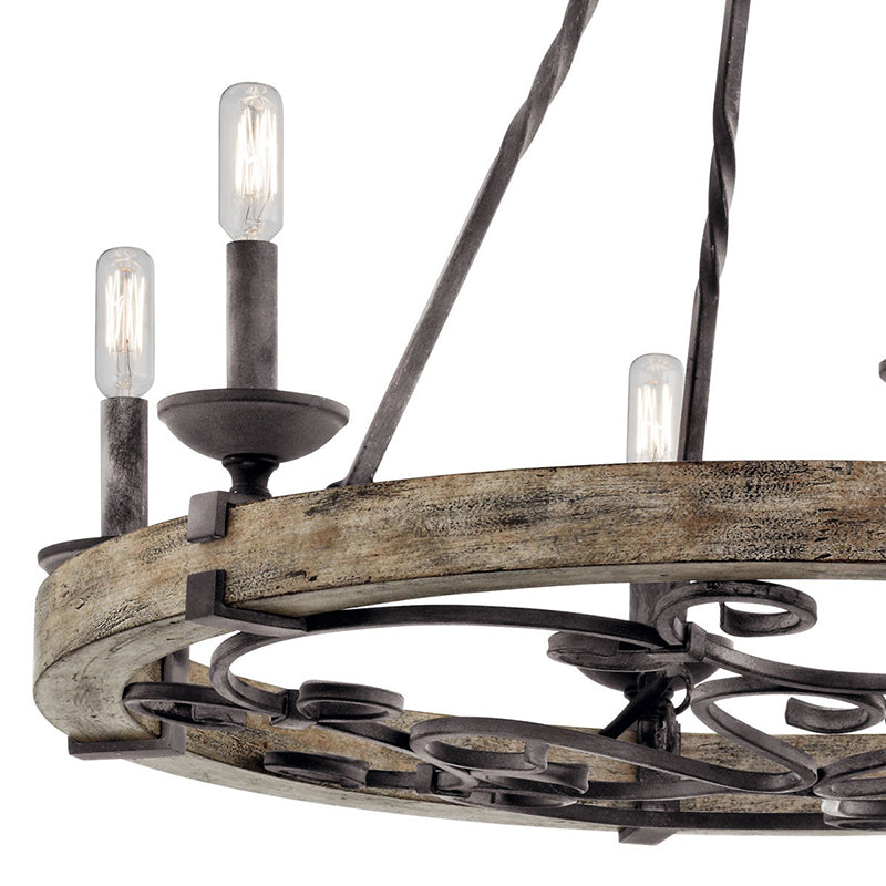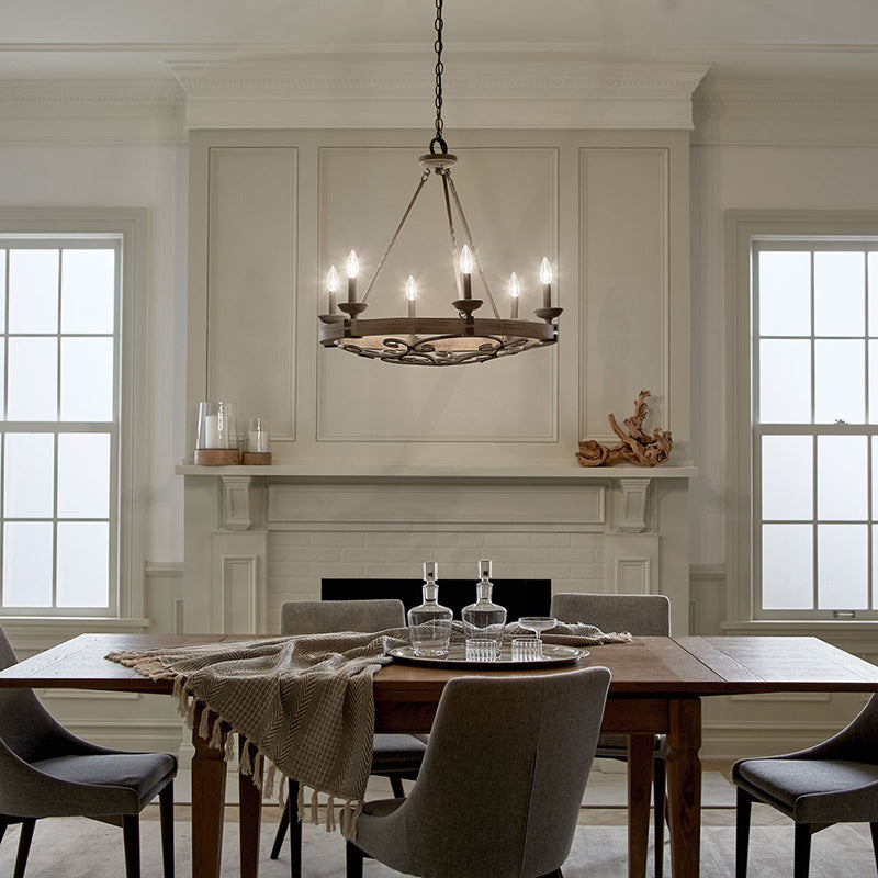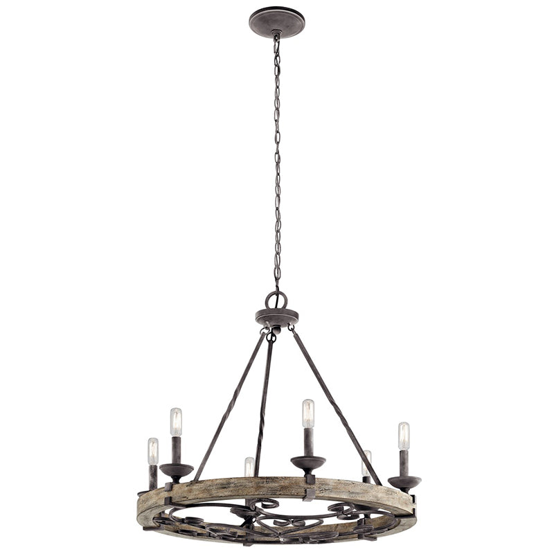 The Lodge inspired style of this 6 light chandelier from the Taulbee collection features an elegant, timeless design with Weathered Zinc detailing coupled with Weathered Grey Wood veneer accents.
