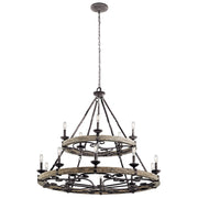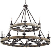 The Lodge inspired style of this 15 light grand chandelier from the Taulbee collection features an elegant, timeless design with Weathered Zinc detailing coupled with Weathered Grey Wood veneer accents.