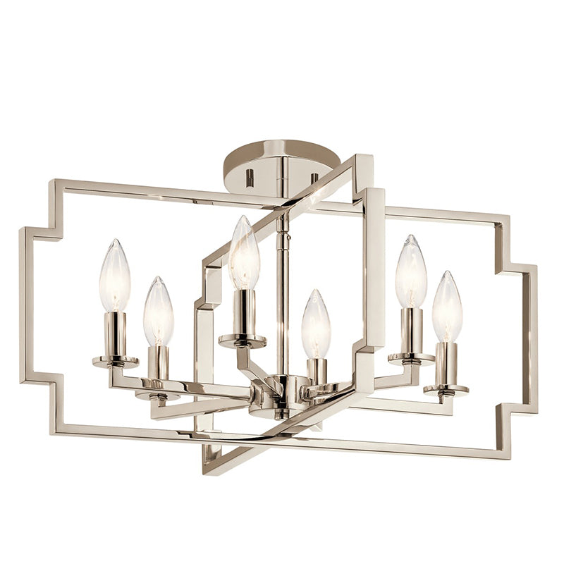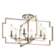 The Downtown Deco 21.5" 6 Light Convertible Chandelier/Semi Flush features a squared edge outer frame that surrounds the curved candle design, allowing the light to fully shine through.