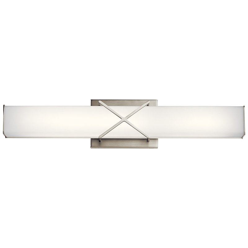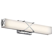 The 22" LED bath light of the Trinsic collection is an intricate, yet subtle aesthetic to complement any modern bath with Satin Etched White glass and a unique criss-cross design.