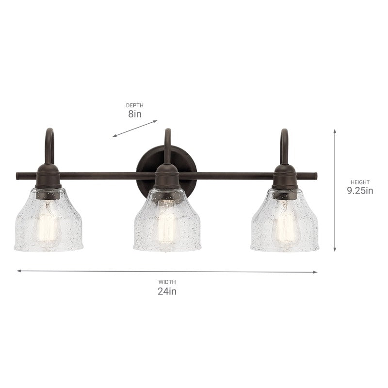 Offering convenience and ease in coordinating with other lighting options, the Avery 3 light vanity light is truly as versatile as it is beautiful. Its clear seeded glass provides a beautiful, ambient lighting to the entire room and is also easy to remove--for ease of cleaning and replacement.