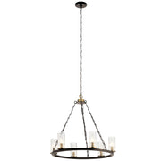 The Mathias 23" 6 light chandelier features a simple rustic style in mixed finishes in Olde Bronze finish and clear ribbed glass.