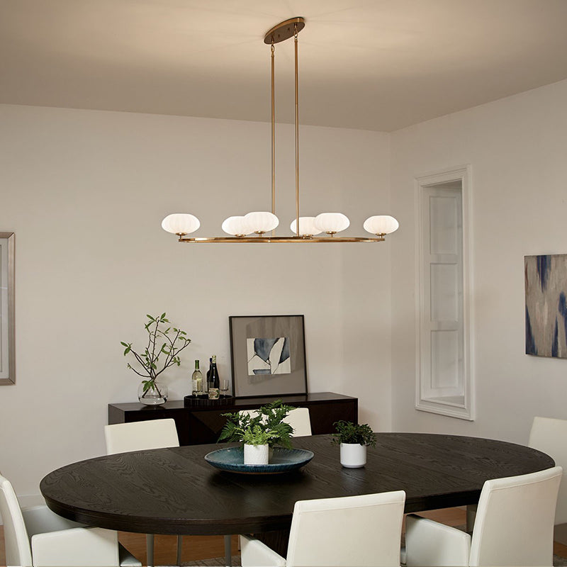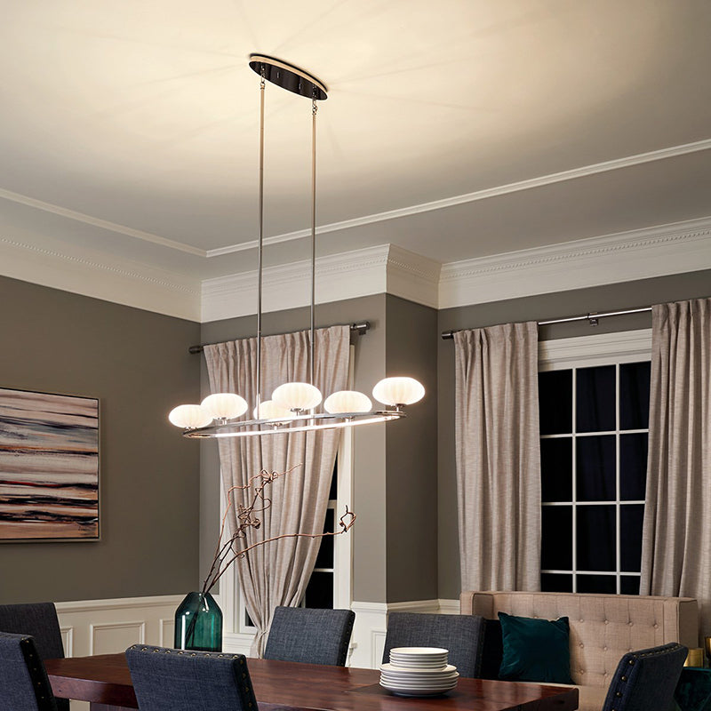 The Pim™ 39" 6 light oval chandelier features a nostalgic mid century modern design in finishes and rounded shaped satin etched cased opal glass.