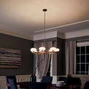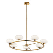 The Pim™ 40" 7 light round chandelier features a nostalgic mid century modern design in finishes and rounded shaped satin etched cased opal glass.