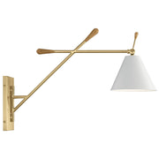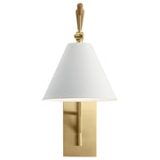The Finnick™ 20" 1 light wall sconce is a decorative light featuring Champagne Gold arms with Natural Maple accents. The attached White shade and head move vertically, and the entire fixture swivels from side to side.