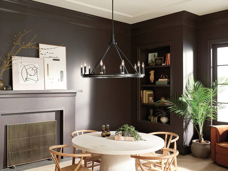 Emmala 27.5 inch 10 light chandelier features candle sleeves resting on Black rings.