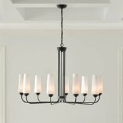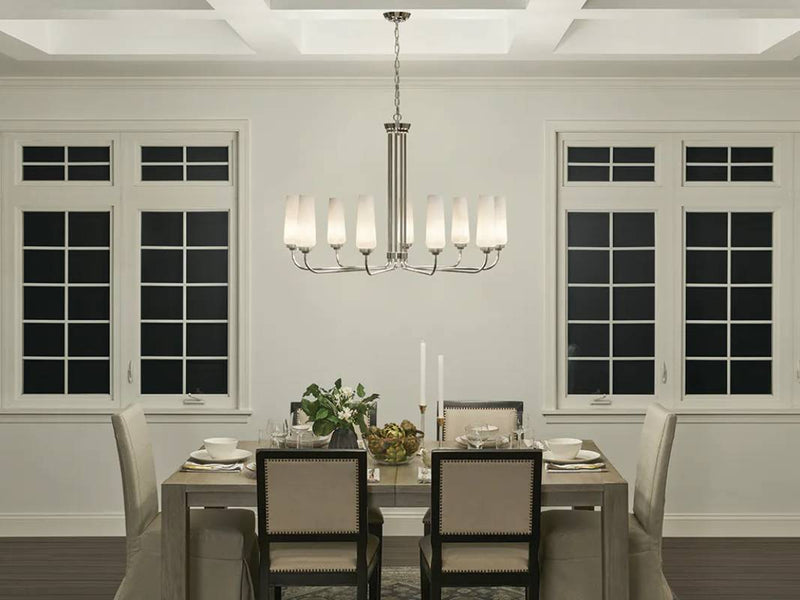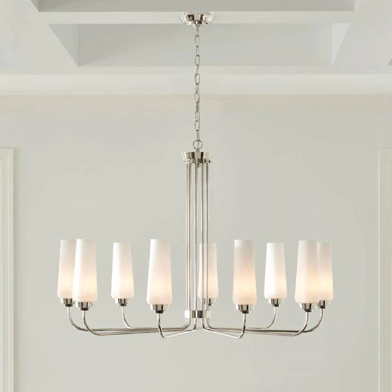 The Truby 9 light chandelier illuminates through aerodynamic-inspired arms made of Satin Etched Cased Opal Glass.