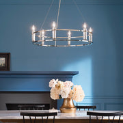 The Rosalind chandelier in polished nickel is true refinement. Its glamorous crystal candle sleeves and stately silhouette allow it to stand out. Nearly invisible cables allow Rosalind to appear suspended mid-air, while its clean silhouette and airy design exude pure elegance.