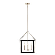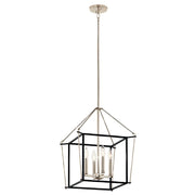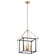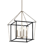 The Eisley foyer pendant's open-framed body design illuminates in a minimalist, modern aesthetic. Its contrasting mixed finish shapes are connected ever-so-slightly with a hook and eye at each corner of the cage. This foyer pendant is constructed without glass, giving the illusion that the fixture is floating.