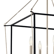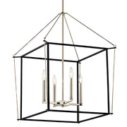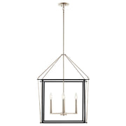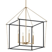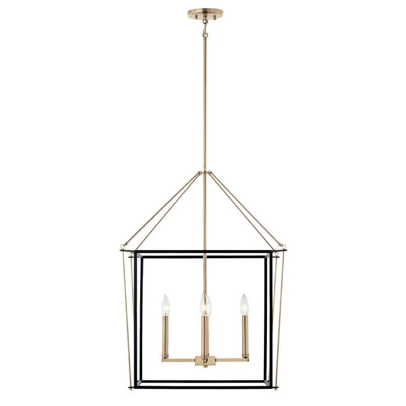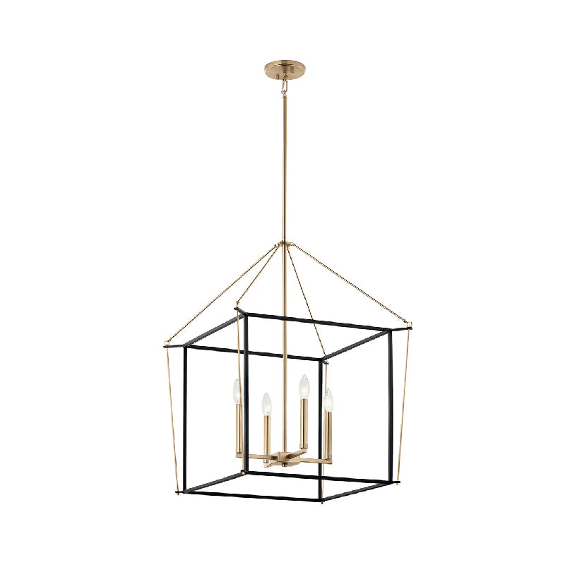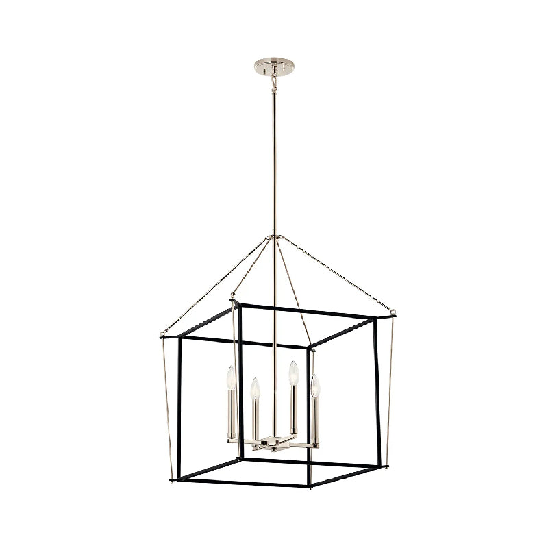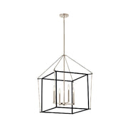 The Eisley foyer pendant's open-framed body design illuminates in a minimalist, modern aesthetic. Its contrasting mixed finish shapes are connected ever-so-slightly with a hook and eye at each corner of the cage. This foyer pendant is constructed without glass, giving the illusion that the fixture is floating.