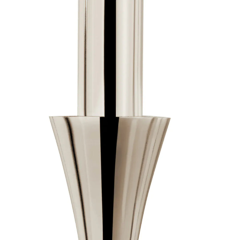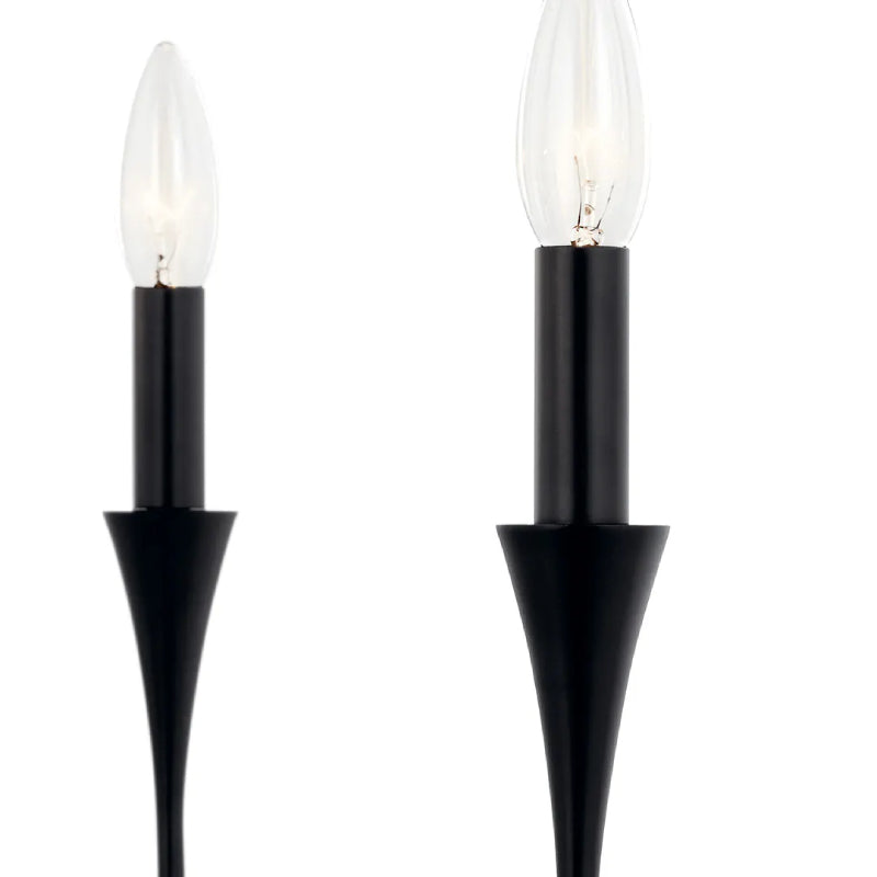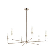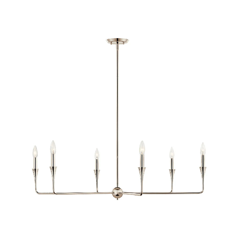 The Alvaro chandelier features a simple silhouette and unique tapered accent. Designed with 90-degree angles, Alvaro starts at the canopy, floats down to the center root of the fixture, and then glides outward and upward with a bloom of light at the end.This fixture also features bobeche on each arm — flaring out into the candlestick for a soft modern look.