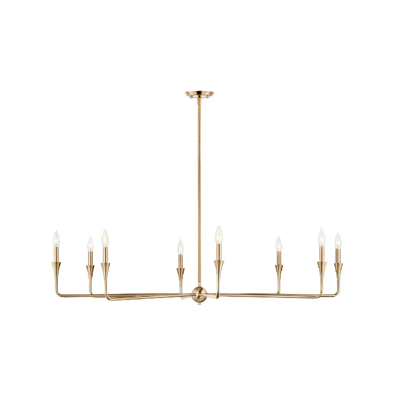 The Alvaro chandelier features a simple silhouette and unique tapered accent. Designed with 90-degree angles, Alvaro starts at the canopy, floats down to the center root of the fixture, and then glides outward and upward with a bloom of light at the end.This fixture also features bobeche on each arm — flaring out into the candlestick for a soft modern look.
