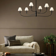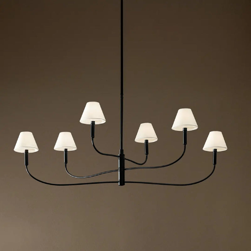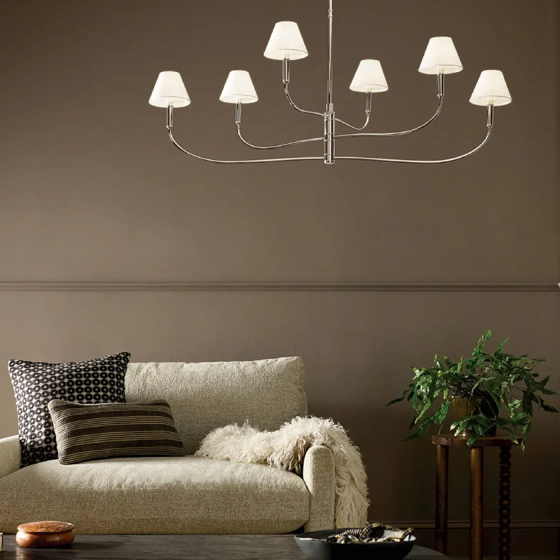The Eadie chandelier balances old-world charm with modern flexibility. Rotate the top and middle arms in round and linear formations for the look you desire. Below each white fabric shade is a removable clear glass diffuser.