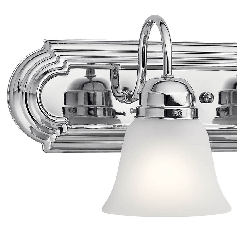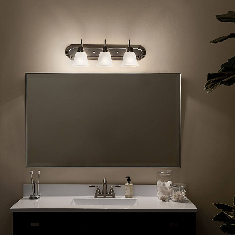 The modern lines of this 24" 3-light bath light fixture in Brushed Nickel and Chrome finish with Satin Etched glass will blend into many decors.