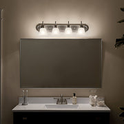 The modern lines of this 30" 4-light bath light fixture in a Brushed Nickel finish with Satin Etched glass will blend into many decors.
