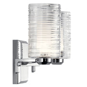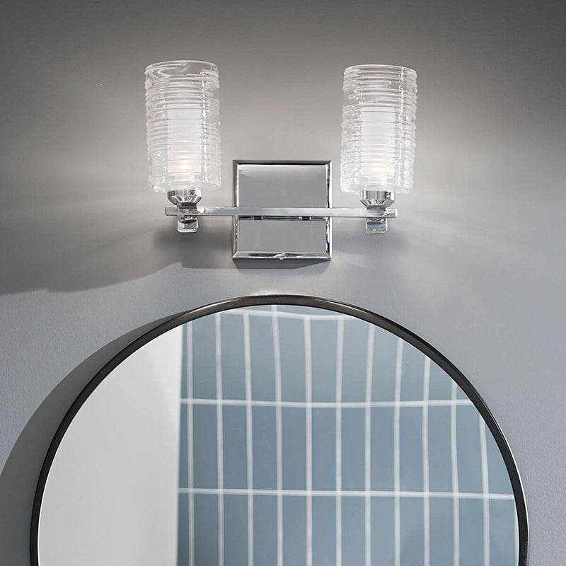 The Giarosa 15" 2 light vanity light features two types of glass around each light: a Clear Hand-Spun Ribbed Outer Glass shade surrounds a Satin Etched Cased Opal Glass shade. It's Chrome finish is the exclamation point on this exciting, contemporary fixture.