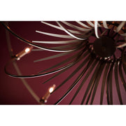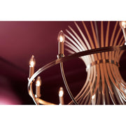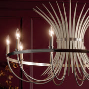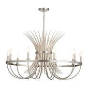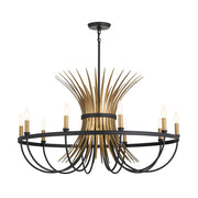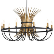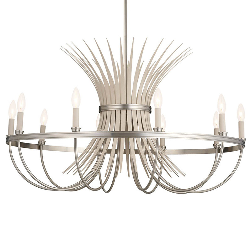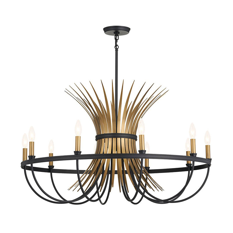 This Baile chandelier refines the gathered wheat motif with elegant Natural Brass arcs, flowing Black curves / Greige arcs, flowing Brushed Nickel curves and gorgeous candelabra bulbs.