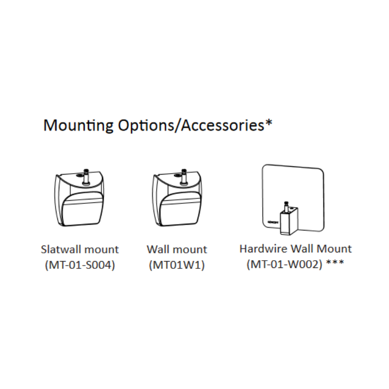 - Mounting: Slatwall Mount, Wall Mount, Hardwire Wall Mount