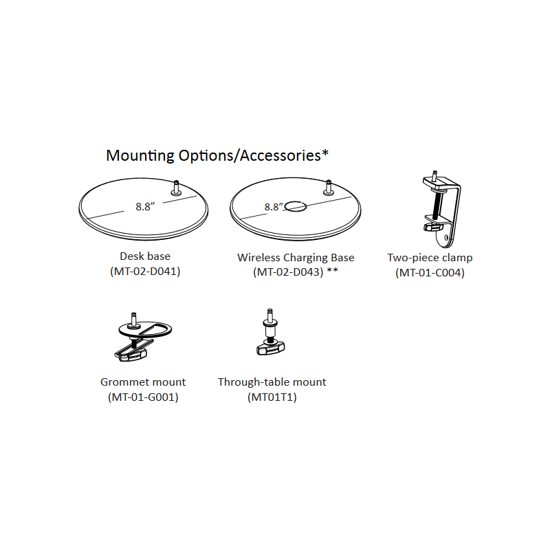 - Mounting: Desk Base, Two-piece Clamp, Grommet Mount, Through-Table Mount, Wireless Charging Base