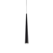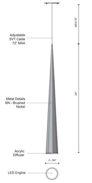 Single LED pendant, sleek conical shape with clear acrylic diffuser, canopy and metal details in brushed nickel and adjustable wire up to 72 inches.