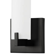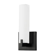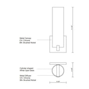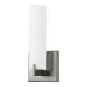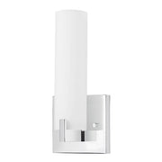 Single lamp LED wall sconce with white opal glass cylinder, metal details and is equipped with our powerful 120V AC LED technology, fully dimmable.