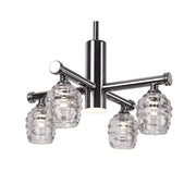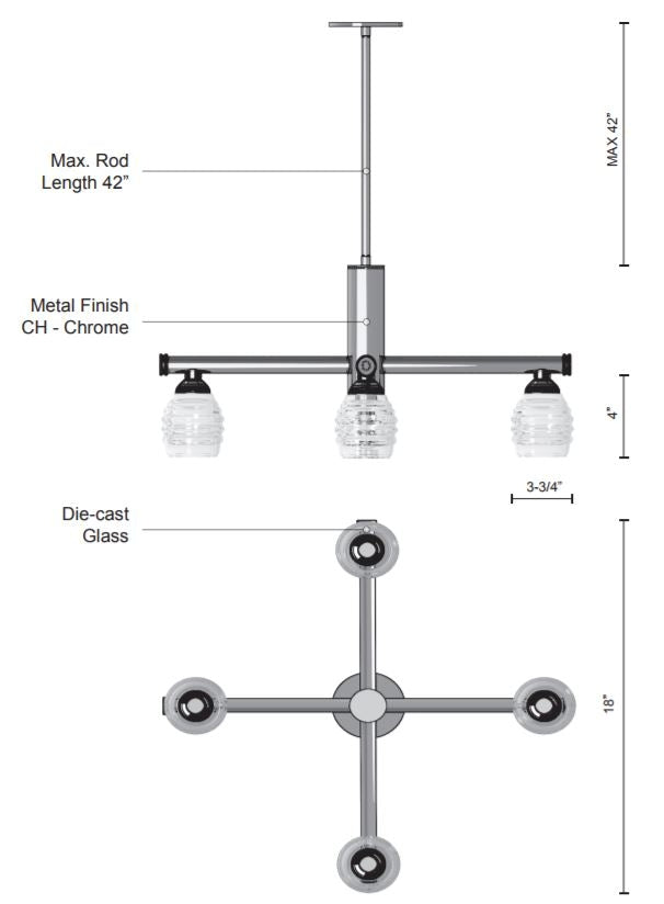 This magnificent vintage but modern designed LED chandelier is truly one of a kind. From the center is a vertical polished chromed cylinder which extent four architecturally designed arms with elegant downward cannikins which omit the light beautifully through each die-cast clear glass.