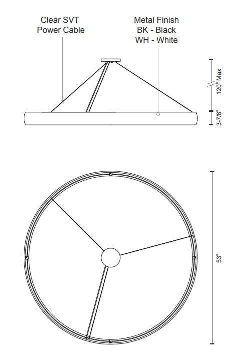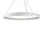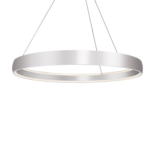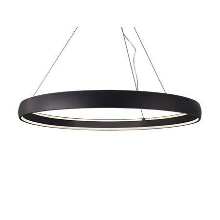 Aircraft cable suspended circular pendant with circular canopy. Soft up/down light is emitted from LED arrays and diffuser concealed within the ring - a design which seems to almost hover within your space. A gentle curve to the disk's external surface adds to the minimal appearance of the design.