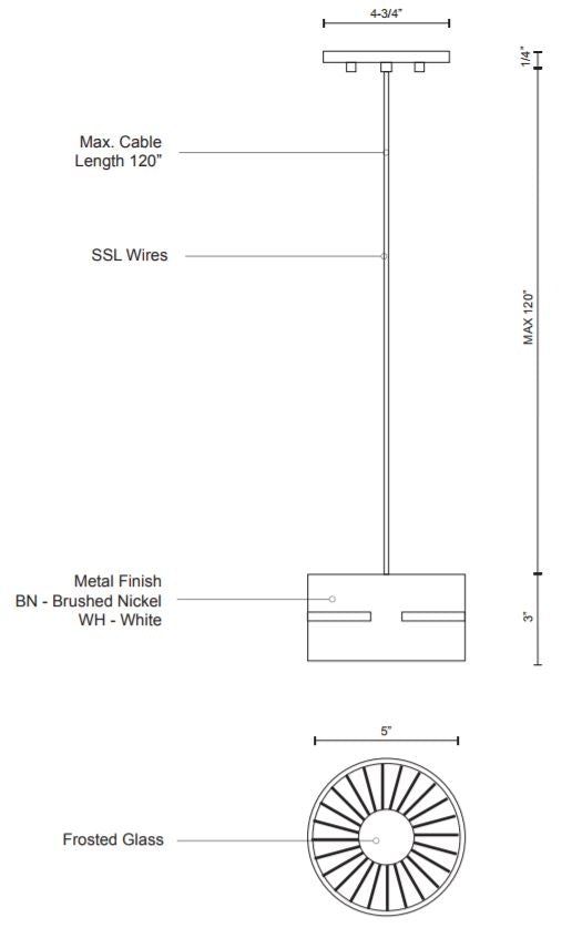 Available metal finishes in brushed nickel and white, with patent pending Kuzco SSL wire adjustable to a maximum of 120". 120V AC LED technology, 9W, fully dimmable.