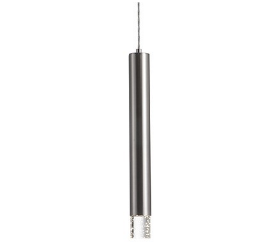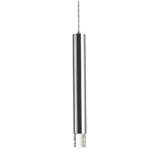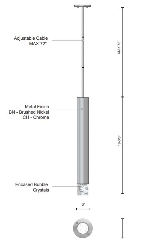 Single lamp LED pendant with a long sleek metal housing in brushed nickel or chrome finishes. At the end of the pendant it is finished with a bubble encased crystal which illuminates the light beautifully throughout the fixture and intensifies the room it resides in.