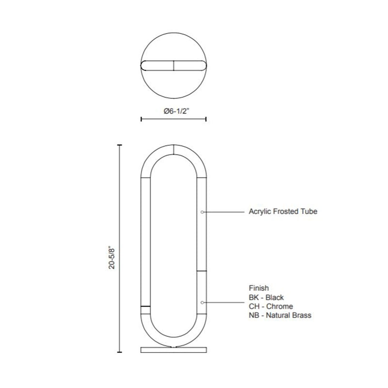 Steel base with die-cast aluminum body, acrylic frosted tube, matte powder-coated or plated finish