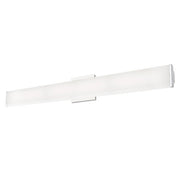 An extruded oblong diffuser surrounds the LED source of the geometric vanity fixture and gently spreads light. Enclosed at the ends by two thick caps the design is characterized by minimal details and clever features. During installation the lamp assembly may slide on the mounting track to allow for ideal positioning.