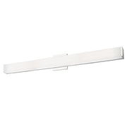 An extruded square diffuser surrounds the LED source of the geometric vanity fixture and gently spreads light. Enclosed at the ends by two thick caps the design is characterized by minimal details and clever features. During installation the lamp assembly may slide on the mounting track to allow for ideal positioning.