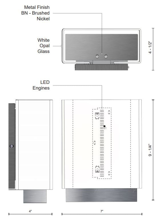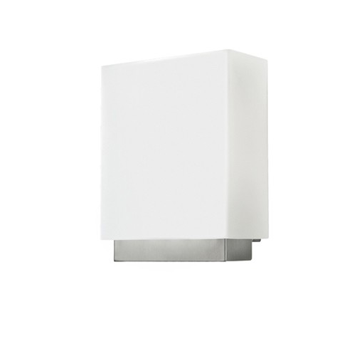 Single LED wall sconce with rectangular shaped white opal glass. Metal details in brushed nickel or chrome finish, and is equipped with our powerful 120V AC LED technology, 11W, fully dimmable.