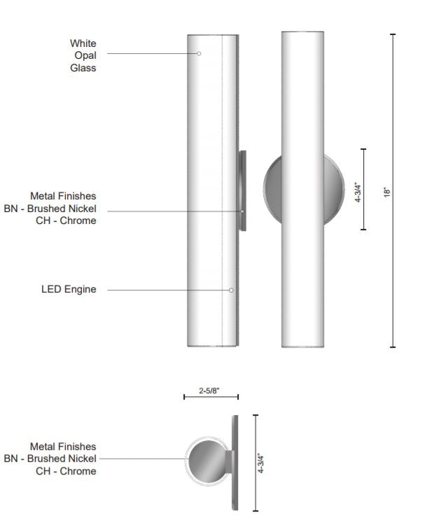 Metal details in brushed nickel or chrome finish and is equipped with our powerful 120V AC LED technology, 18W, fully dimmable. Available in for two different styles and sizes, view series for more details.