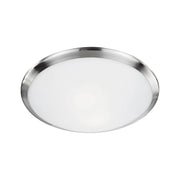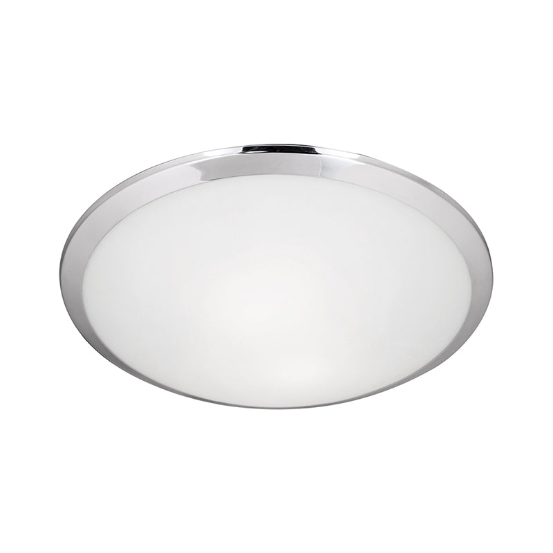Single lamp flush mount ceiling fixture with white opal glass and your choice of brushed nickel or chrome metal finish.
