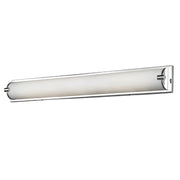 Single lamp LED vanity with white opal glass half cylinder and metal side covers. Metal details available in chrome finish, and is equipped with our powerful 120V AC LED technology.