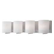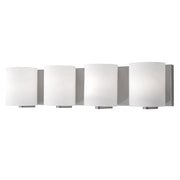 Four lamp vanity with white opal cylinder glass with your choice of brushed nickel or chrome metal details.