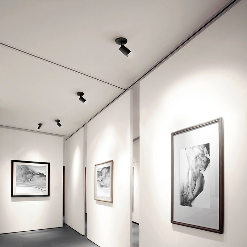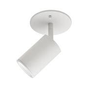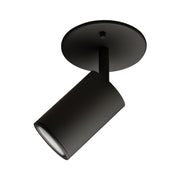 Cylindrical lamp head with recessed bulb socket. Circular attachment plate with vertical stem. Powder-coat finish. Adjustable directional light (90 Degrees).