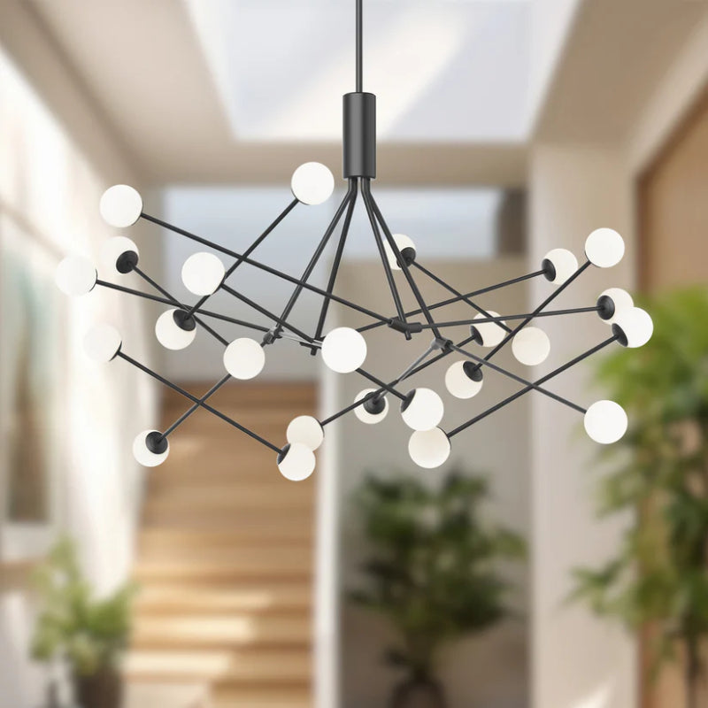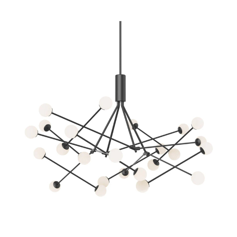 A chaotic constellation of radiant globes seemingly levitate about the center of the Moto geometric structure. Fine intersecting metal arms project the opal glass globes from the gravitational center and allow for positional adjustment during assembly.
