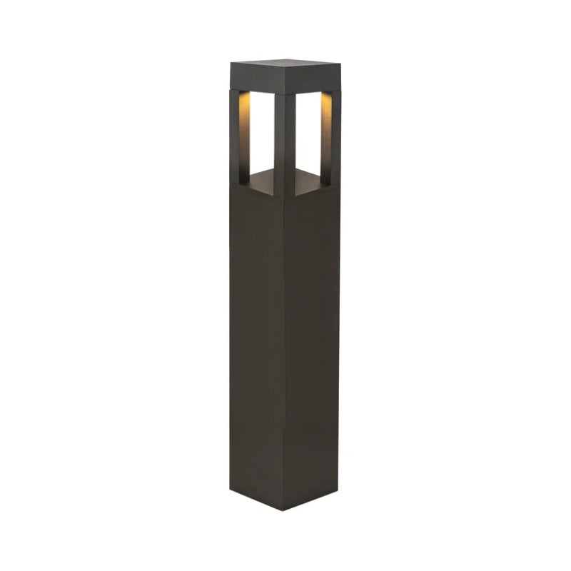 Architectural designed high powered LED exterior bollard fixture, high pressure die-cast aluminum square-shaped housing with four rectangular-shaped openings which radiates the light downward and throughout all openings and surrounding areas of the bollard.