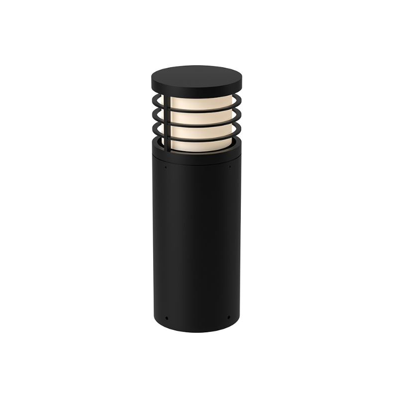 Architecturally designed high-power LED exterior bollard fixture. This die-cast aluminum cylinder has a frosted polycarbonate diffuser with thin metal halos that delivers diffused omni directional light with three base sizes and interchangeable head options.