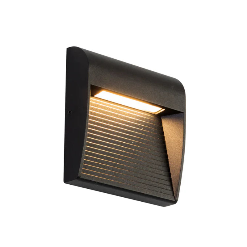 Newly re-designed Non-Climbable exterior wall-mounted fixtures. Light is directed downward from a recess, and the incline allows the glow to radiate gradually. Vanishingly thin and ideal for egress, courtesy, and grace lighting.